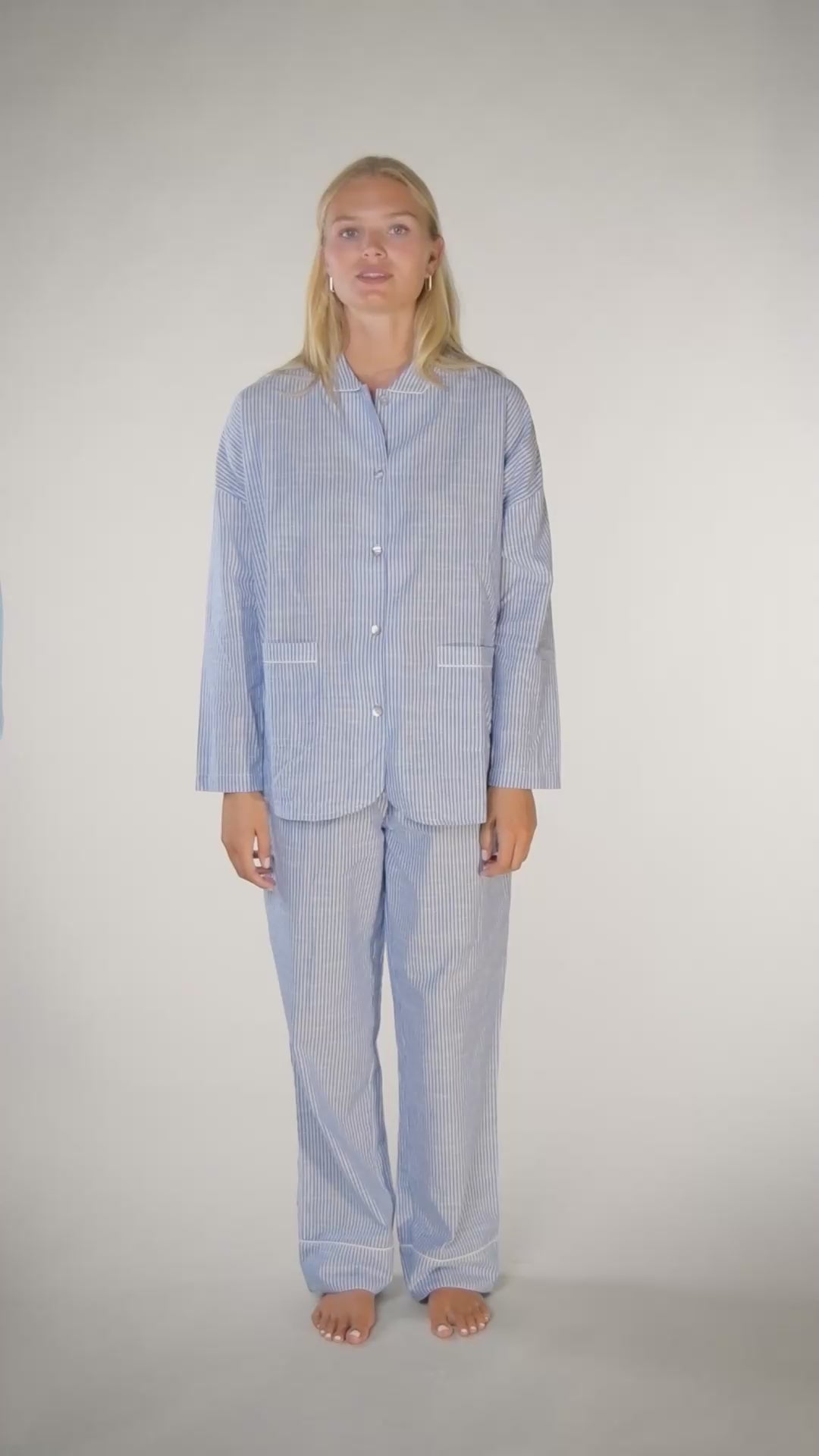 Elegante natbukser med blå striber til en langsom morgen eller aften. Du kan også tulre rundt i dem hele weekenden, hvor der er tid til: fordybelse, selvkærlighed, meditation - og andre aktiviteter, der giver dig ro. Pia Pants fra CCDK Copenhagen har elastik i buksekanten, en sløjfe i toppen og piping ved buksekanten, som giver designet et feminint præg.